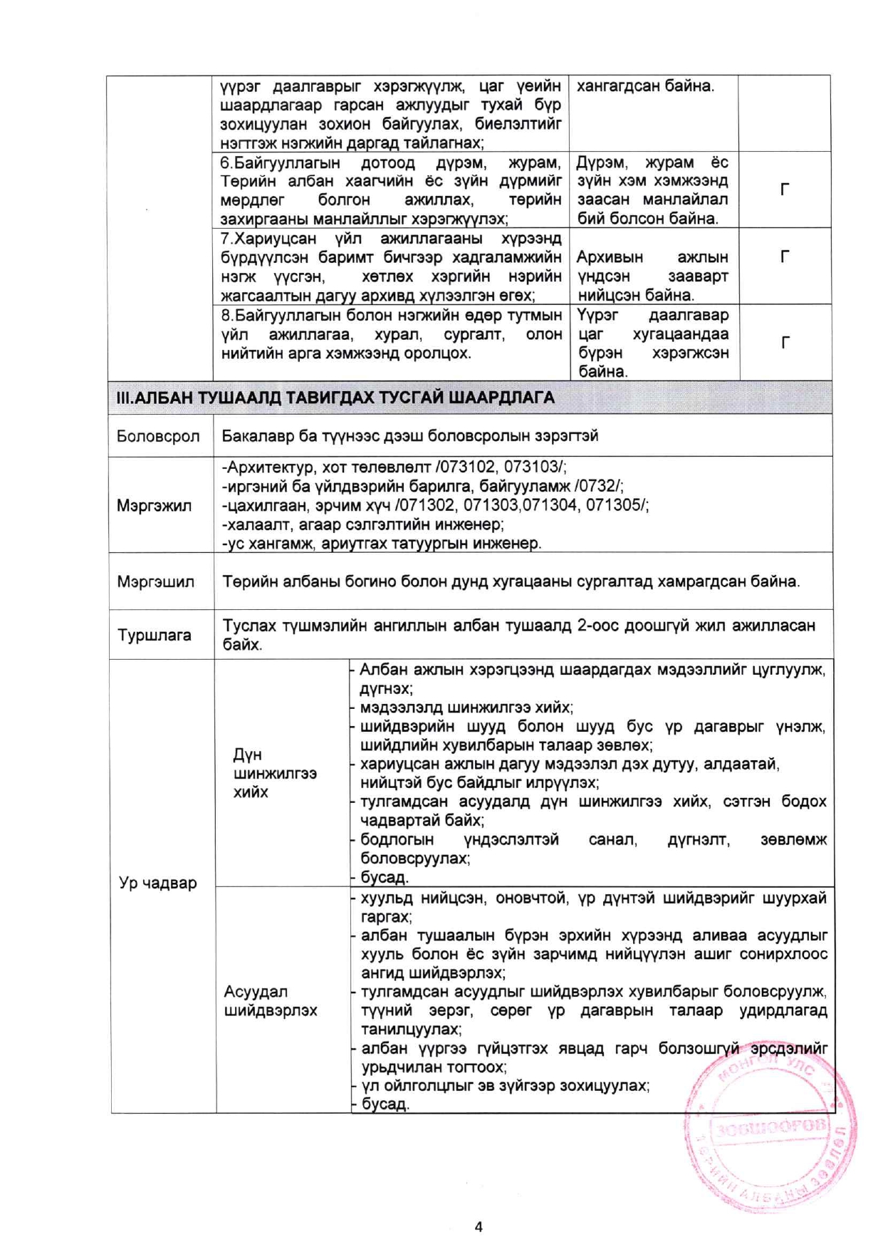 Барилгын асуудал хариуцсан ахлах мэргэжилтэн